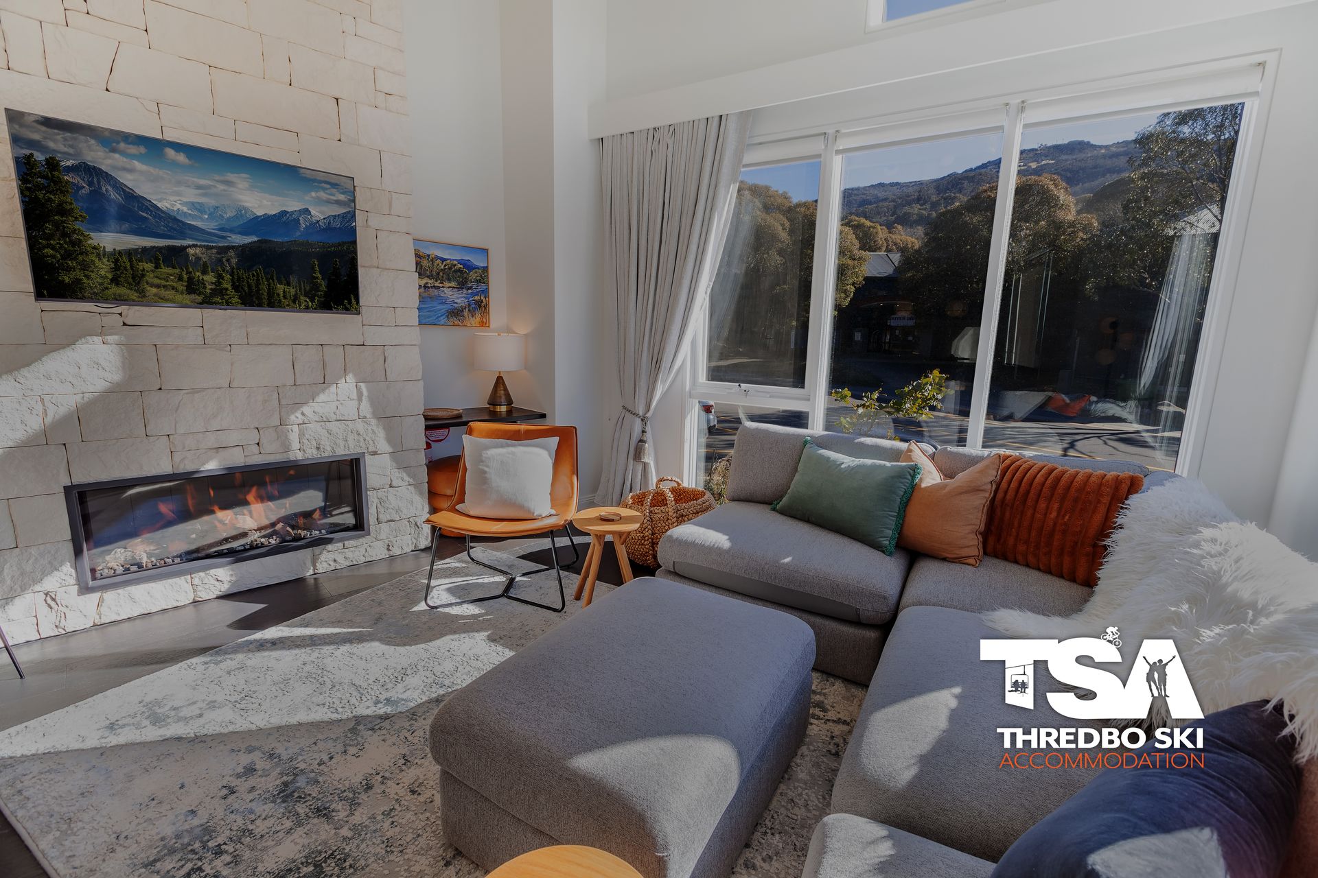 The living spaces at Akuna 3 exude warmth and sophistication. The open-plan living area welcomes you with its inviting fireplace, creating the perfect ambience for cosy evenings with family and friends. North and west-facing floor-to-ceiling windows frame the breathtaking mountain views, while bathing all living areas with warmth and sunshine throughout the day. Sink into plush sofas, unwind, and recount the day's adventures.