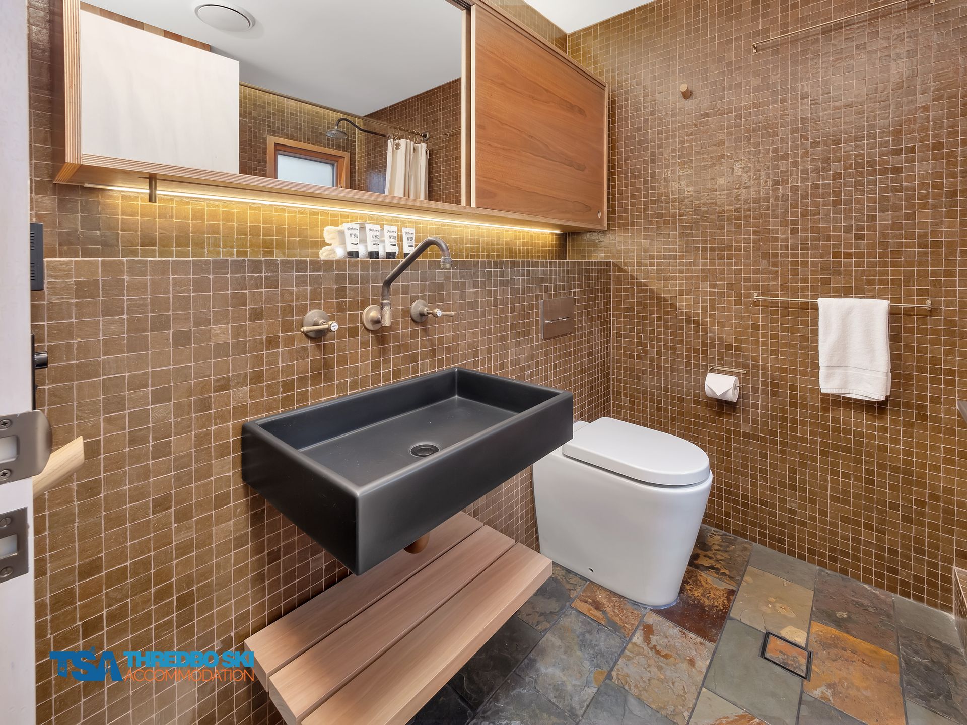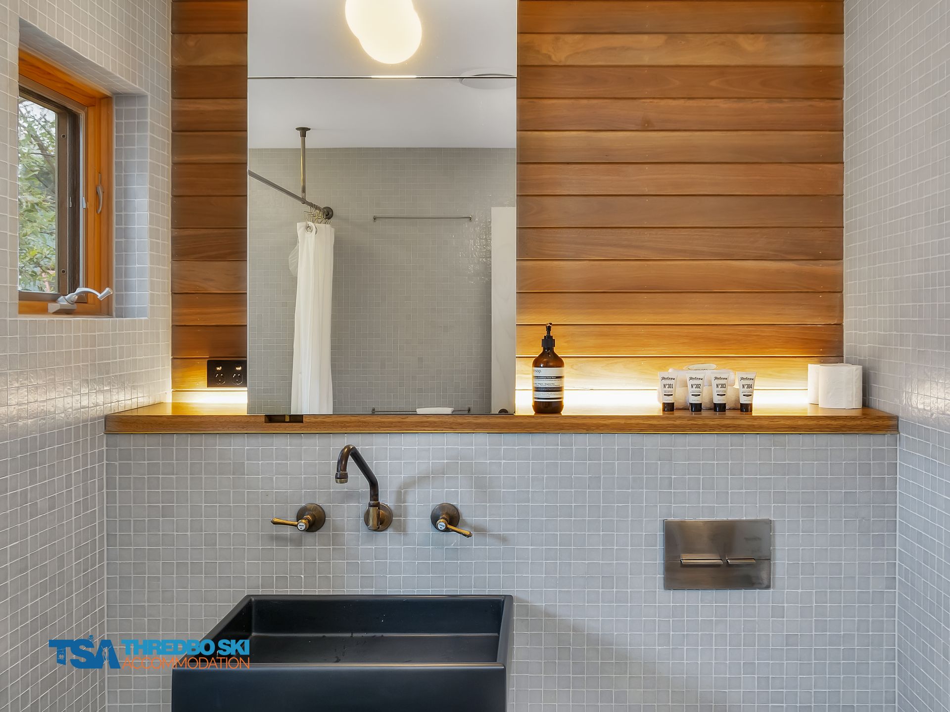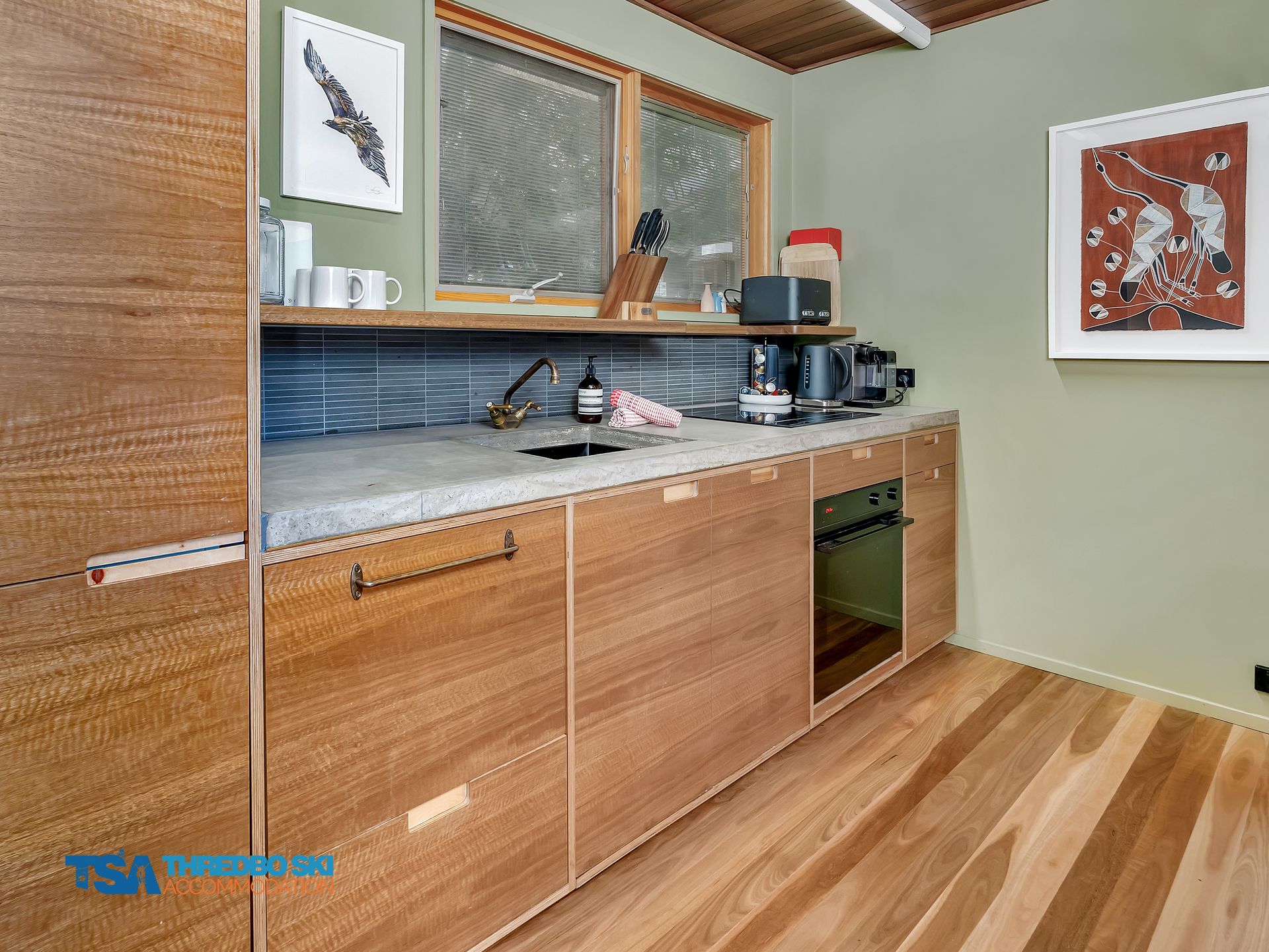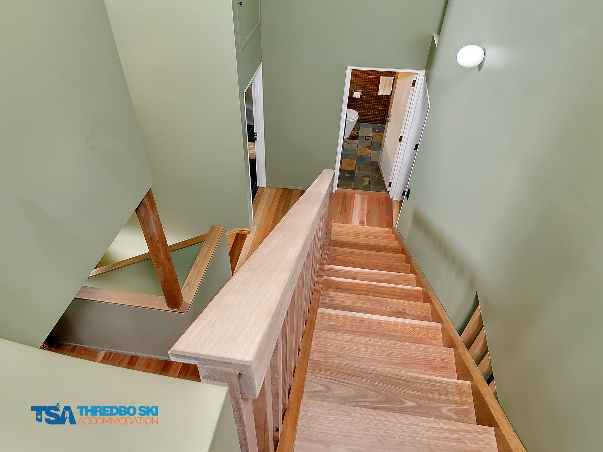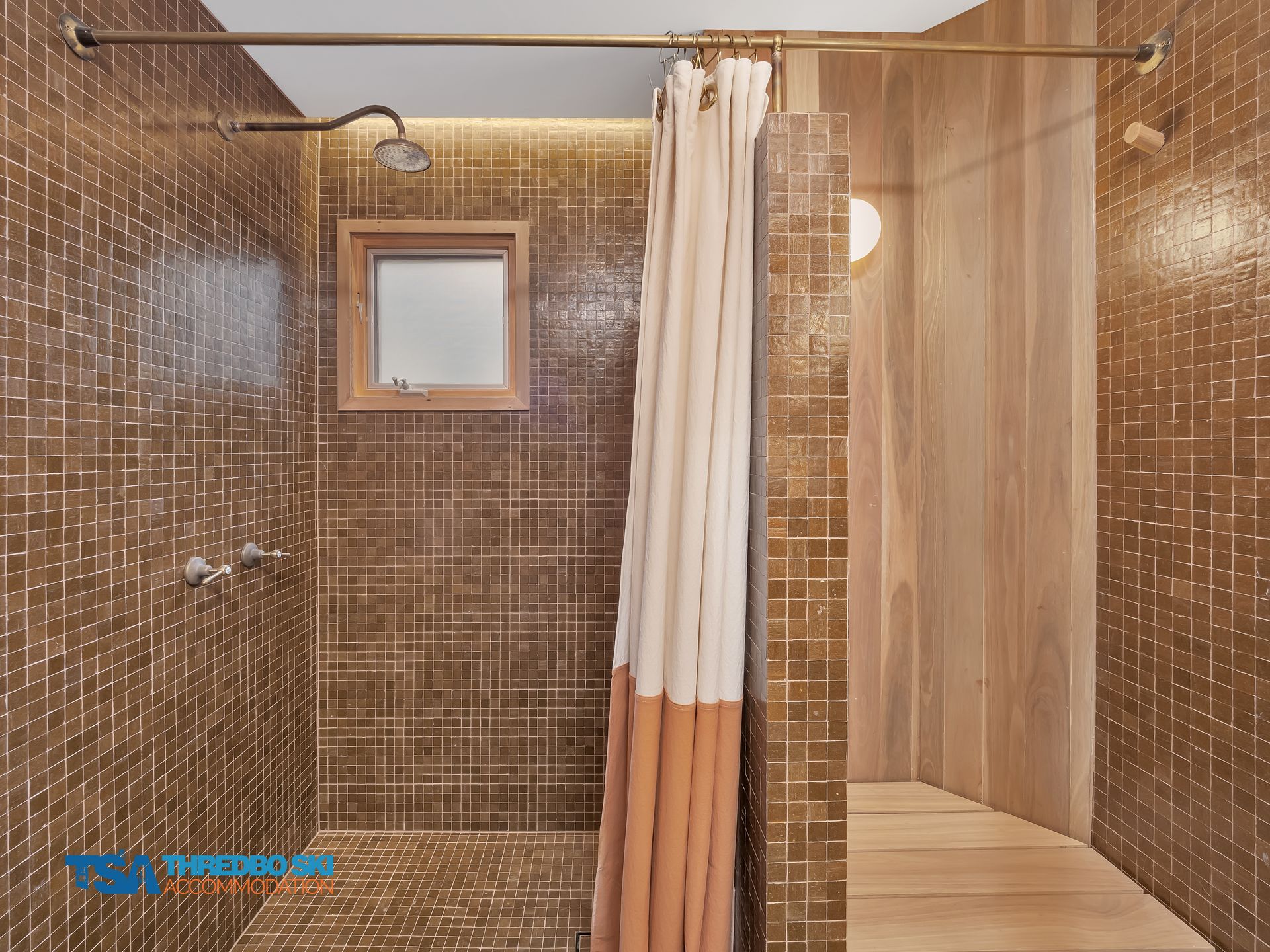 Upstairs houses 2 bedrooms, 2 bathrooms, and a study nook for any necessary work commitments. The layout ensures privacy and convenience for guests.