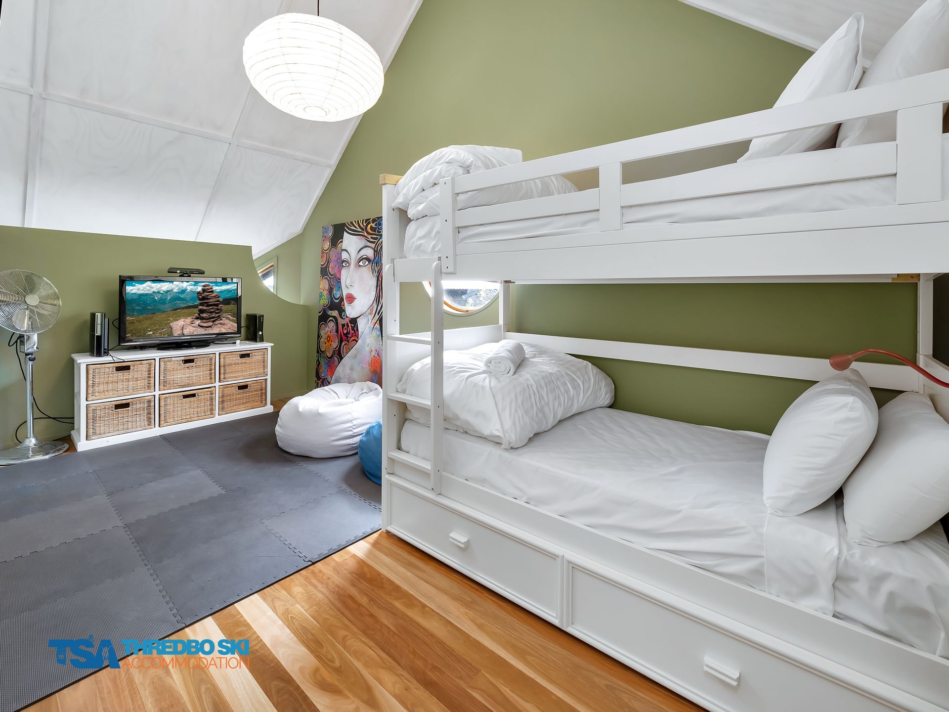 The loft area offers a dedicated space for kids, featuring a TV area and bunks, perfect for the younger members of the group to unwind and enjoy their time.