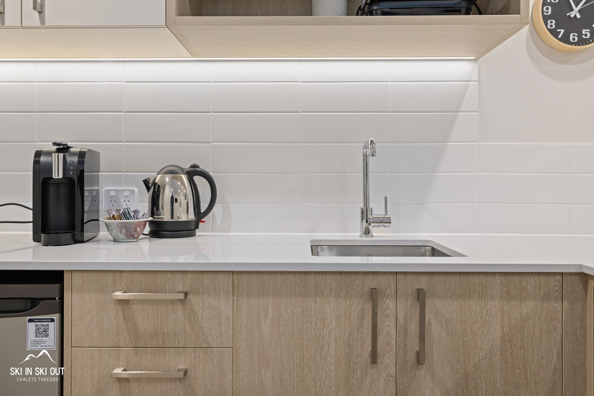 The kitchenette has a two burner electric hob, microwave, small fridge and coffee machine. There is also a combined washer/dryer. The shuttle bus stop is only a minute stroll from your door and the village centre is only a short 6-minute walk.