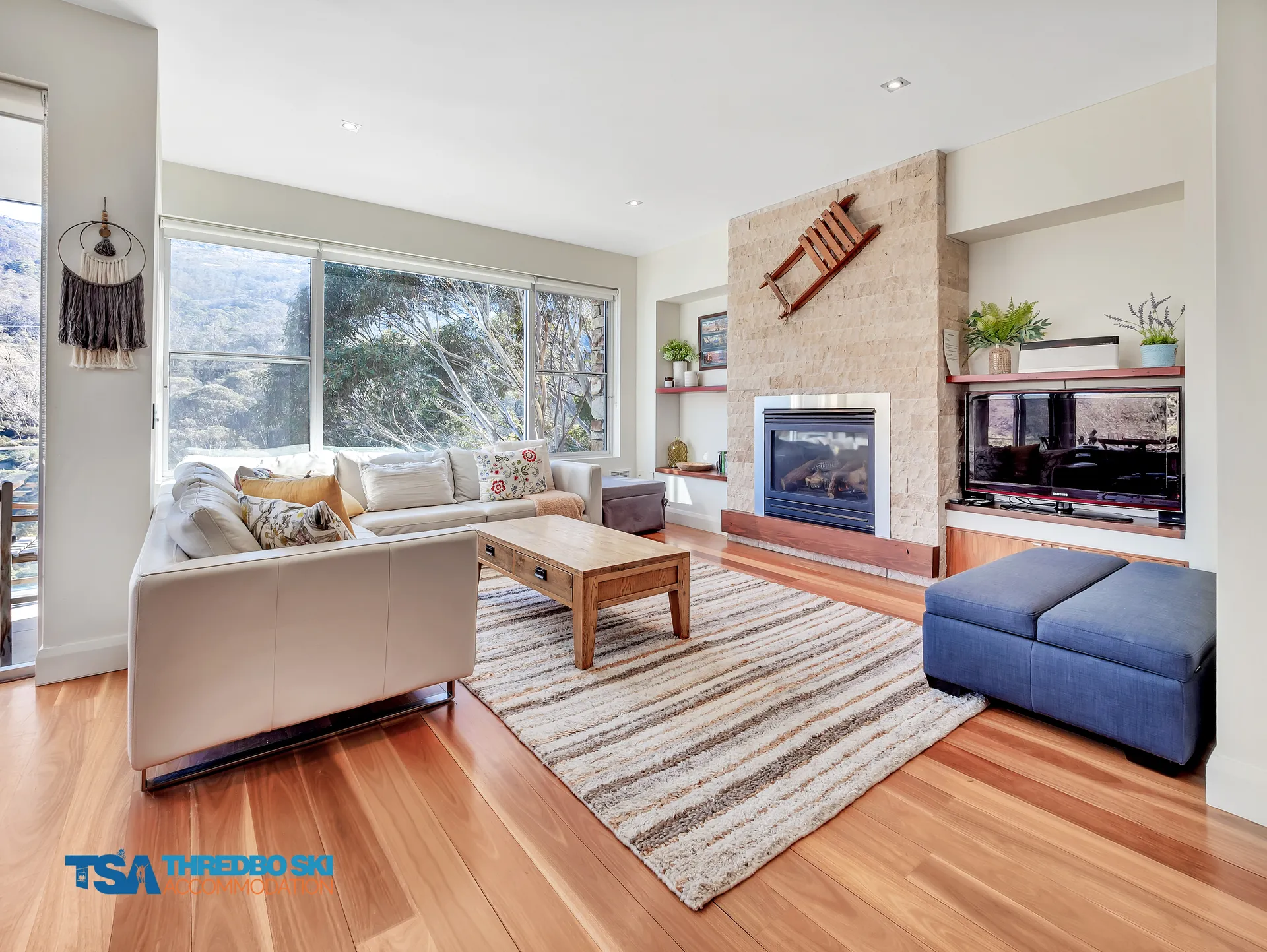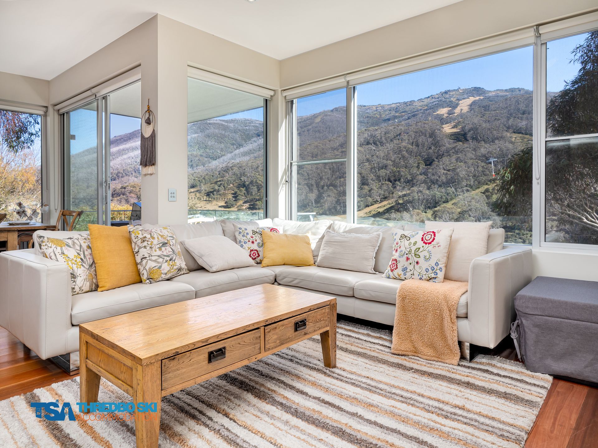 The large open-planned kitchen, dining, and living area looks across to the main ski slopes and down into the Village. Stunning views whether it's summer or winter.